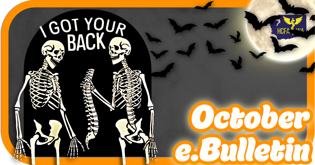 Graphic reads 'October e.Bulletin' with an illustration of two skeletons, one holding the removed spine of the other, with the text 'I got your back'. Bats fly toward a glowing moon with the Health Care for All-WA logo in the center.